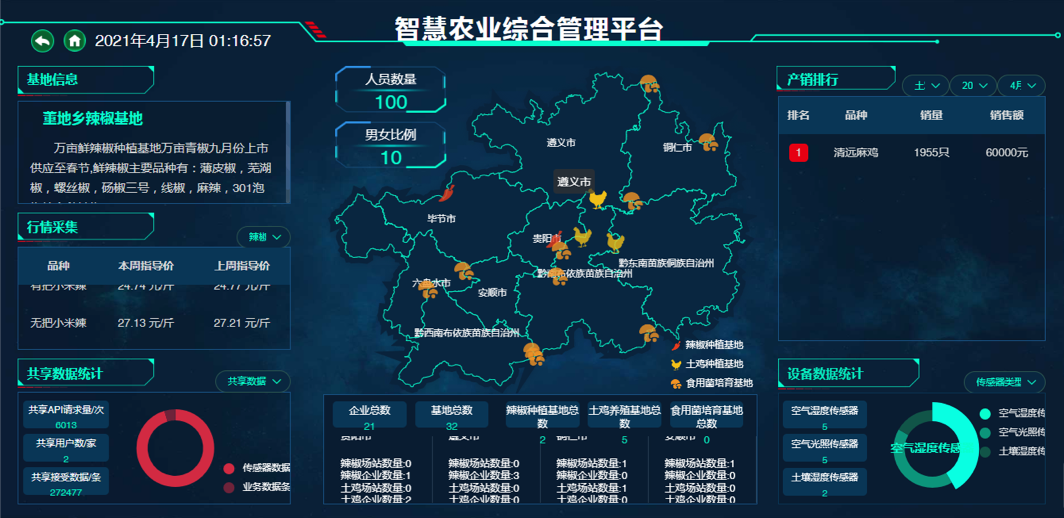 针对不同渠道挖掘的辣椒育种育苗、大田生产种植、销售流通等数据进行分析,根据数据分析结果进行有效的管控, 相关数据可以通过大屏进行直观展示,依托部署在生产现场的各个传感节点和无线通信网络实现农业生产环境的智能感知、 智能预报预警、智能分析、智能决策、专家在线指导,为项目试验示范地辣椒提供育苗生产、栽培种植、经营销售等大数据管理运营服务。