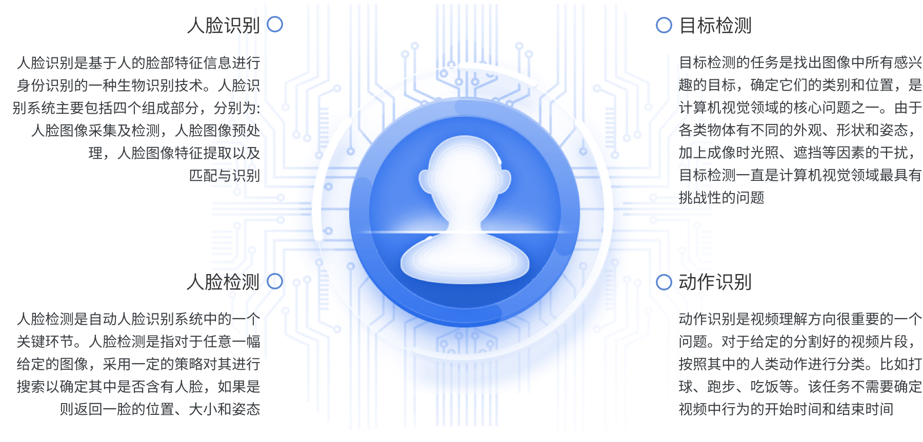 人脸与人体识别包含人脸识别、目标检测、人脸检测和动作识别等能力,灵活运用于金融、安防、零售等场景。