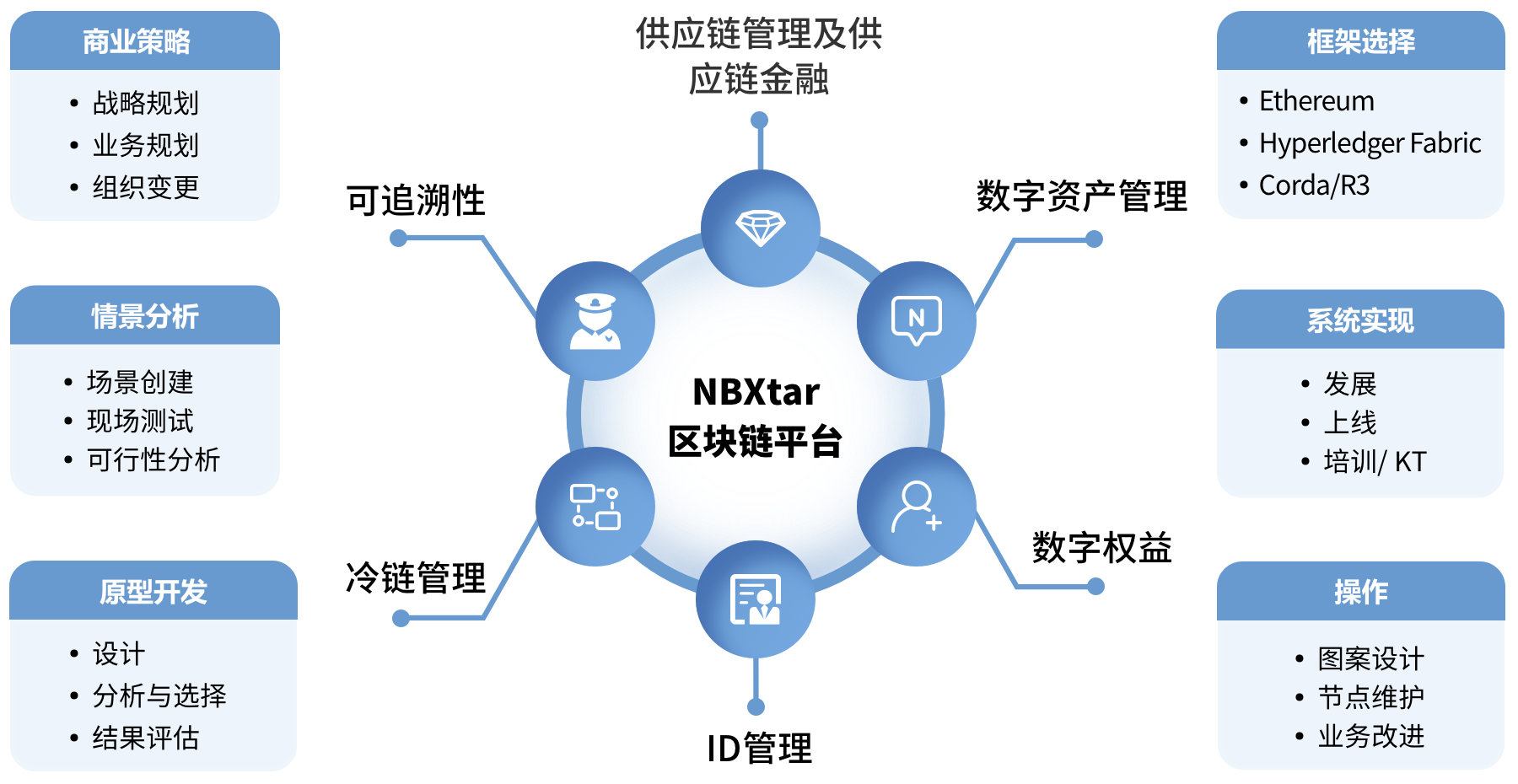 NDIT研发了一系列区块链产品,包括区块链基础组件“NBXtar”、区块链配置管理工具集、以及基于NBXtar产品构建的NBXtar基础设施服务云平台。NBXtar基础设施服务云平台提供标准化区块链云服务,面向工程实践、易于集成的区块链基础组件,全称为NTT DATA China Blockchain Star。可以有效利用已有数据中心资源, 统一标准、统一部署,摆脱平台不兼容、依赖关系混乱、网络配置复杂等难题,做到一键部署。