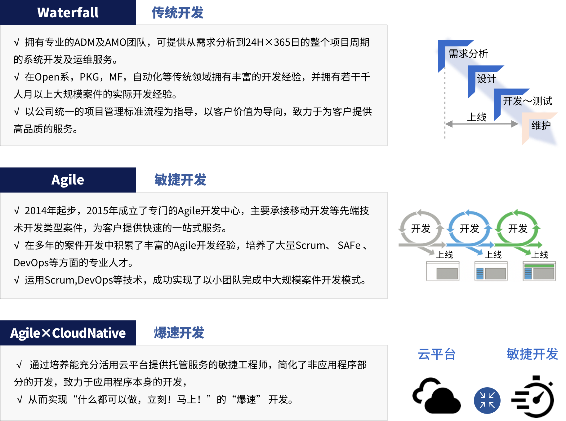 根据客户需求提案适合的开发手法。例如:Agile x CloudNative、Agile x Mobile、offshore x Agile、Agile + Waterfall等。